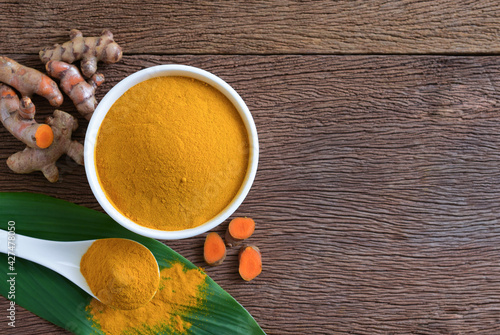 Turmeric powder in a white bowl and fresh turmeric (curcumin) on wooden background,Top view,copy space.