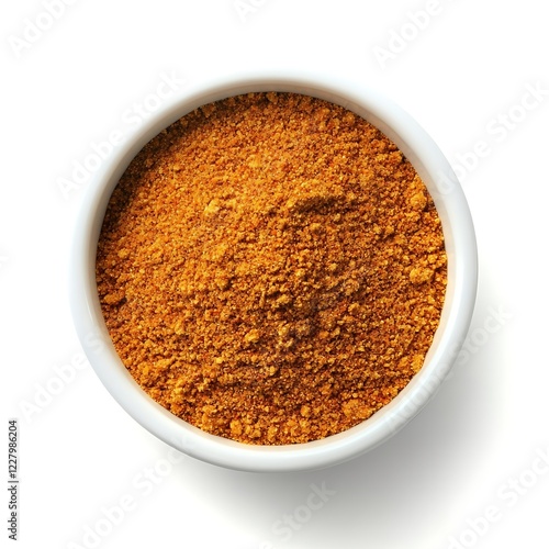 Turmeric powder in bowl isolated on white background. Top view