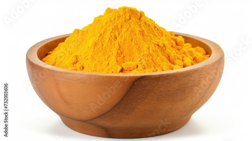 turmeric with yellow powder in a wooden bowl isolated on a white background, front view