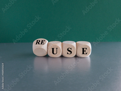 Turned a dice and changes the word use to reuse. Beautiful green background, grey table. Ecology And Sustainability concept.