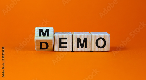 Turned cube and changed the word 'demo' to 'memo'. Beautiful orange background. Business and demo and memo concept. Copy space.