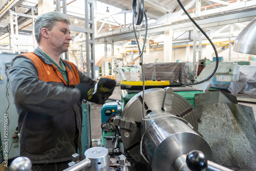Turner worker manages the metalworking process of mechanical cutting on a lathe.