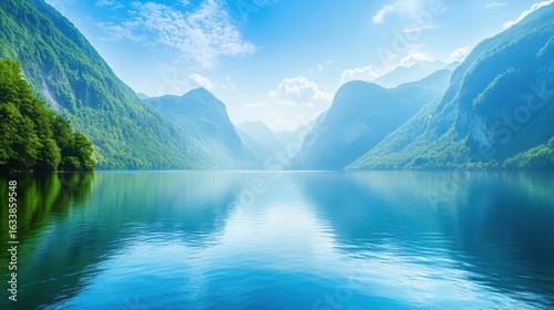Turquoise fjord between green mountains under blue sky