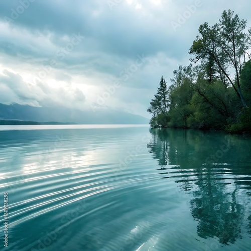 Turquoise Lake Under Dramatic Cloudy Sky: Peaceful Landscape with Forest Reflection & Mountain Views Stock Photo.