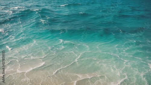 Turquoise ocean water with gentle waves and sandy shore in bright sunlight