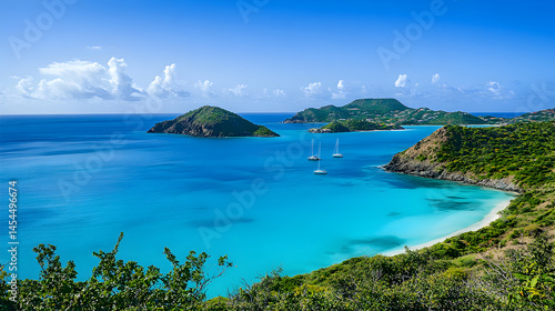 Turquoise water meets white sand on a tropical island coast under a blue summer sky