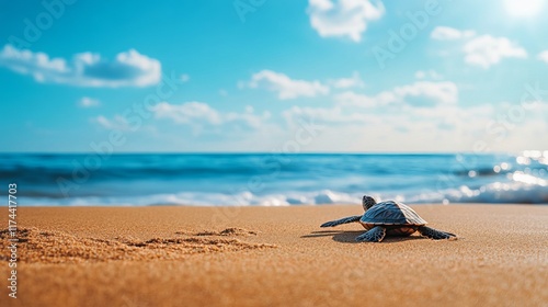 Turtle Crawling Out of the Sea to Lay Eggs on the Sand Under a Bright Blue Sky