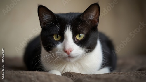 Tuxedo cat with striking yellow eyes, lying down on a brown surface.