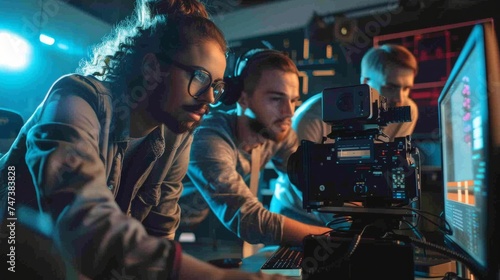 TV engineer at editor in studio. TV editor working with vision mixer in a television broadcast gallery.Man sat at a vision mixing panel in a television studio gallery