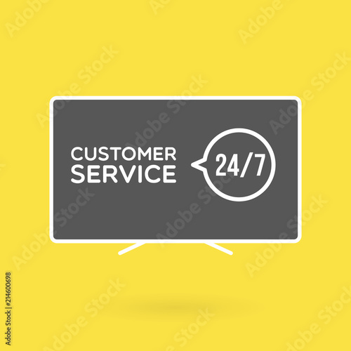 TV screen customer service 24/7 illustration. Concept of 24/7, open 24 hours, support, assistance, contact, customer service. Vector illustration, flat design