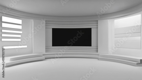 Tv Studio. News studio.3D rendering. White background. White studio. Backdrop for any green screen or chroma key video or photo production.