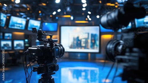 TV studio with a newscaster and high-tech cameras, ready for breaking news coverage in a professional media setting.