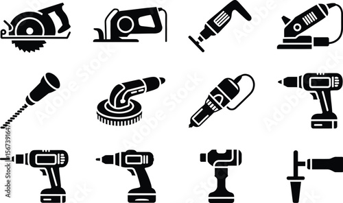 Twelve Black Power Tools Icons Set Circular Saw Drill