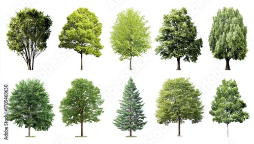 Twelve diverse trees against white background. Various shades of green foliage, different shapes and sizes, isolated