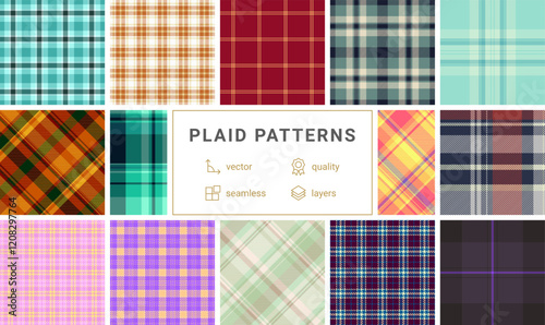 Twelve vibrant plaid patterns in various colors and styles. Seamless vector designs perfect for textile prints, website backgrounds, or fashion projects. Highquality layered files for easy editing.