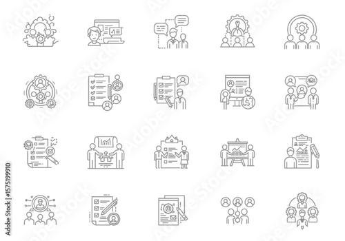 Twenty graytoned icons represent business concepts with human figures gears documents and data