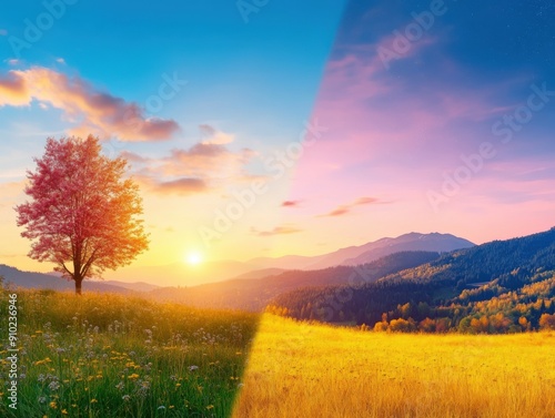 Twilight over serene hills with vibrant autumn tree and golden fields