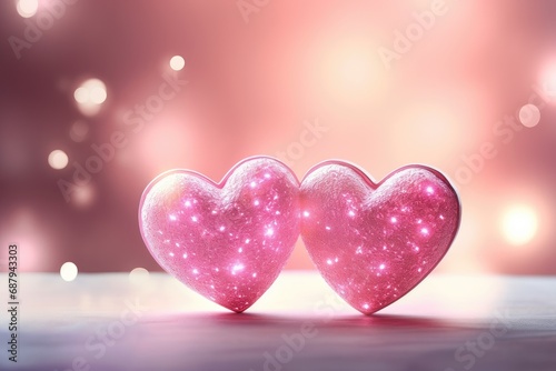 Twin Pink Hearts Glowing with Sparkles and Love on Bokeh Background. Generative AI