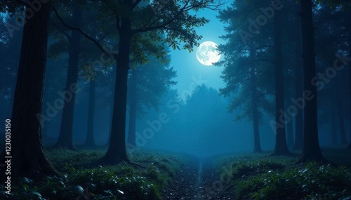 Twinkling moonlight filtering through dense woodland foliage cast silver shadows on forest floor, lunar, mystical, trees
