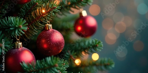 Twinkling red ornaments scattered around a pine tree's branches, christmas, tree, shining
