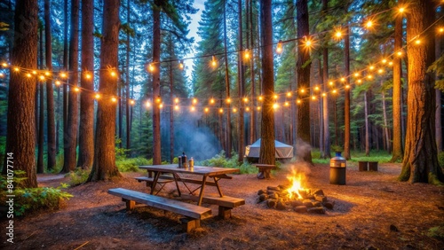 Twinkling string lights illuminate a secluded campground at dusk, where a sizzling barbecue grill and picnic table beckon, surrounded by serene forest landscape.