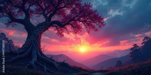 Twisted branches claw at a bruised twilight sky, gnarled roots like skeletal fingers , photo, suspense