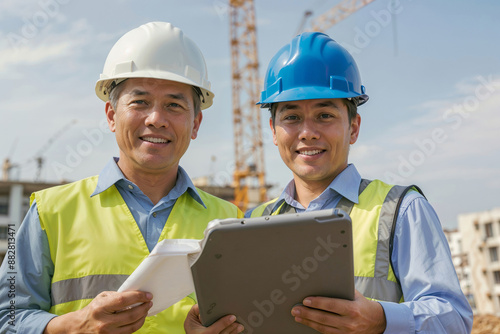 Two construction manager wearing safety hardhat gear are smiling and holding construction project, smile for the camera on building site