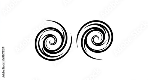 Two abstract black swirling graphic spirals, dynamic and decorative vector elements.
