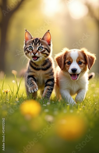 Two adorable furry friends a striped cat and a cheerful puppy dog run through a sunny spring meadow. Happy pets on green grass. Friendship animals, best friends, happy pets, fun time.