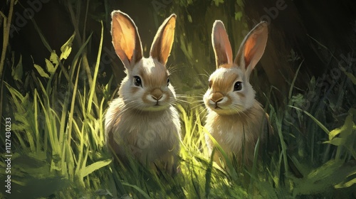 Two adorable rabbits in a sunlit forest clearing surrounded by grass