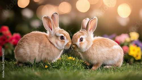 Two adorable rabbits nuzzling each other in vibrant garden filled with colorful flowers. warm, soft lighting creates charming and intimate atmosphere, perfect for capturing their playful bond