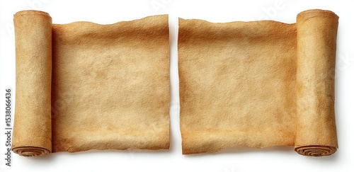 Two aged parchment scrolls lie unfurled on a white background, suggesting antiquity and a blank canvas for storytelling or historical documentation