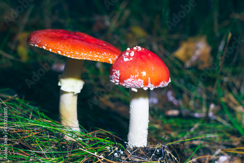 Two Amanita Muscaria, Known as the Fly Agaric or Fly Amanita: Healing and Medicinal Mushroom with Red Cap Growing in Forest. Can Be Used for Micro Dosing, Spiritual Practices and Shaman Rituals