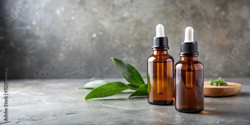 Two amber bottles of essential oil with dropper tops, placed on a textured grey surface, with green leaves in the background.