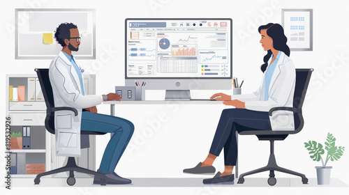 Two animated healthcare professionals are seated opposite each other at a desk, with a computer displaying medical data, in a modern office environment.