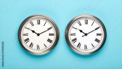 Two antique-style wall clocks against a vibrant light-blue background, displaying a timeless and calm atmosphere.