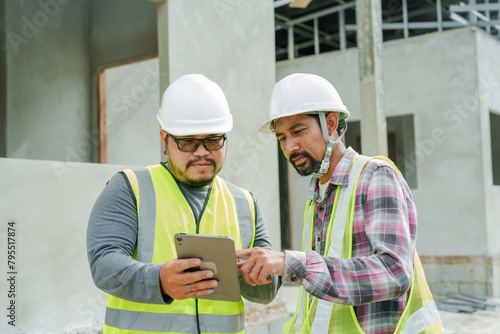 Two Asian adult males in safety vests and helmets stand by a building under construction, one holding a tablet, pointing and explaining. Architects and engineers supervise house construction.