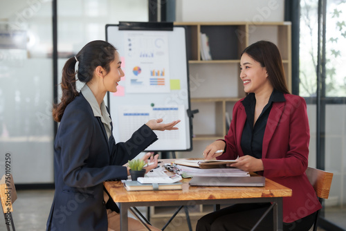 Two asian businesswomen discussing and reviewing documents in office. Professional workplace consultation. Corporate business and teamwork concept.