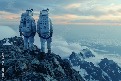 Two astronauts in space suits stand on a craggy peak, looking out at the breathtaking sunset skyline