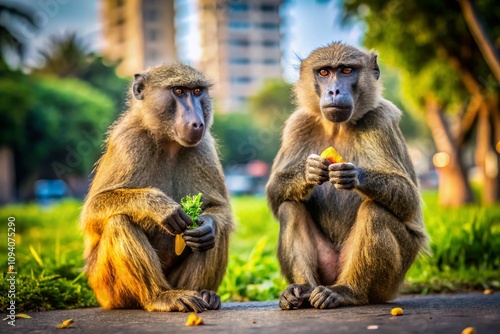 Two Baboons Eating on the Ground in Their Natural Habitat, Capturing the Essence of Wildlife and Primate Behavior in Urban Exploration Photography
