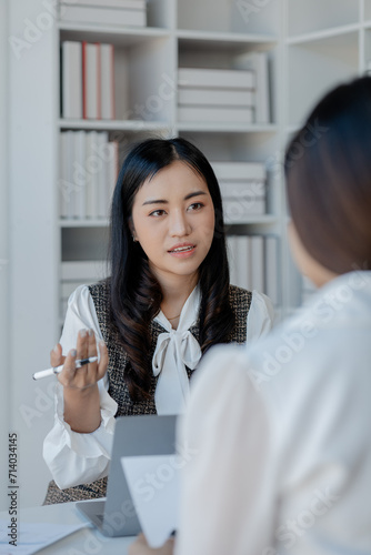 Two beautiful female colleagues interacting while working in office, business colleagues working together on desktop computer at office, Colleagues problem solving at computer together