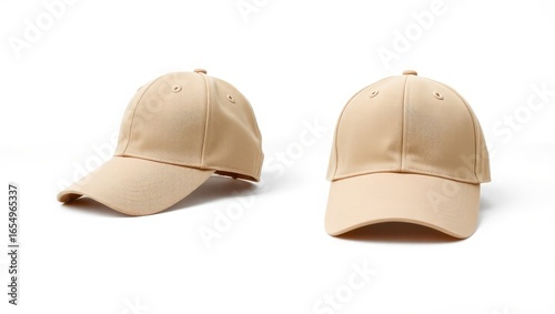 Two beige baseball caps, one shown from the side and one from the front, isolated on a white background.