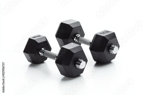 Two black hexagonal dumbbells on a white background, designed for fitness and weight training.