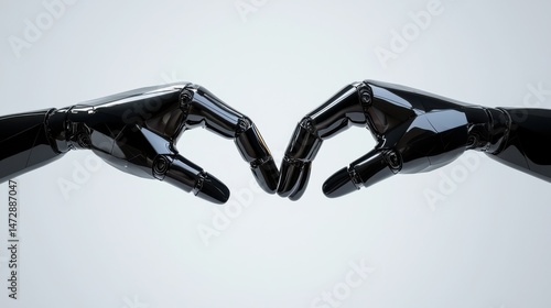 Two black robotic hands reach toward each other, fingertips almost touching, against a plain light background.