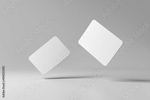 two blank business card mockups floating on a grey background with a soft shadow, two white round-cornered cards flying in the air for design presentation and branding mock-up template