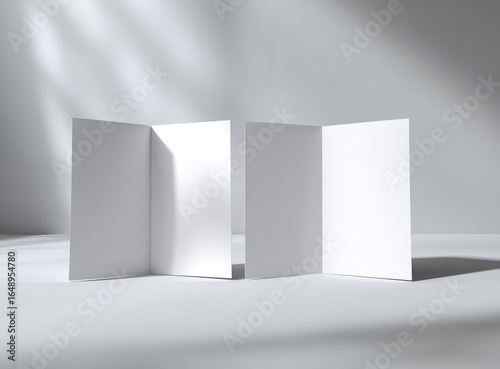 Two blank tri-fold brochures on a light gray surface, bathed in soft sunlight