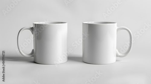 Two blank white coffee mugs on a white background for mockup or design. Ideal for branding, advertising, and product presentation.