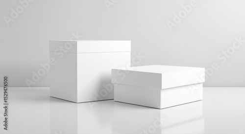 Two blank white gift boxes, different sizes, on a reflective surface