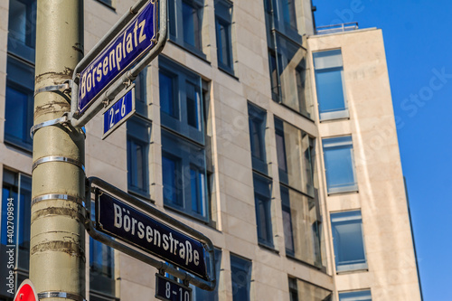 Two blue street signs stock exchange place and stock exchange street on a gray lamppost with fixings. House with window facade in the background