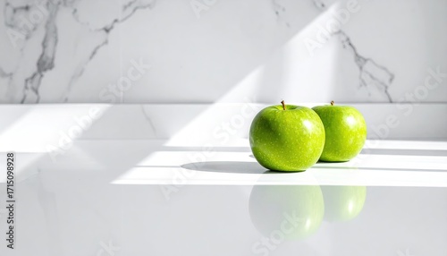 Two bright green apples sit on a reflective white surface, bathed in sunlight against a marble backdrop